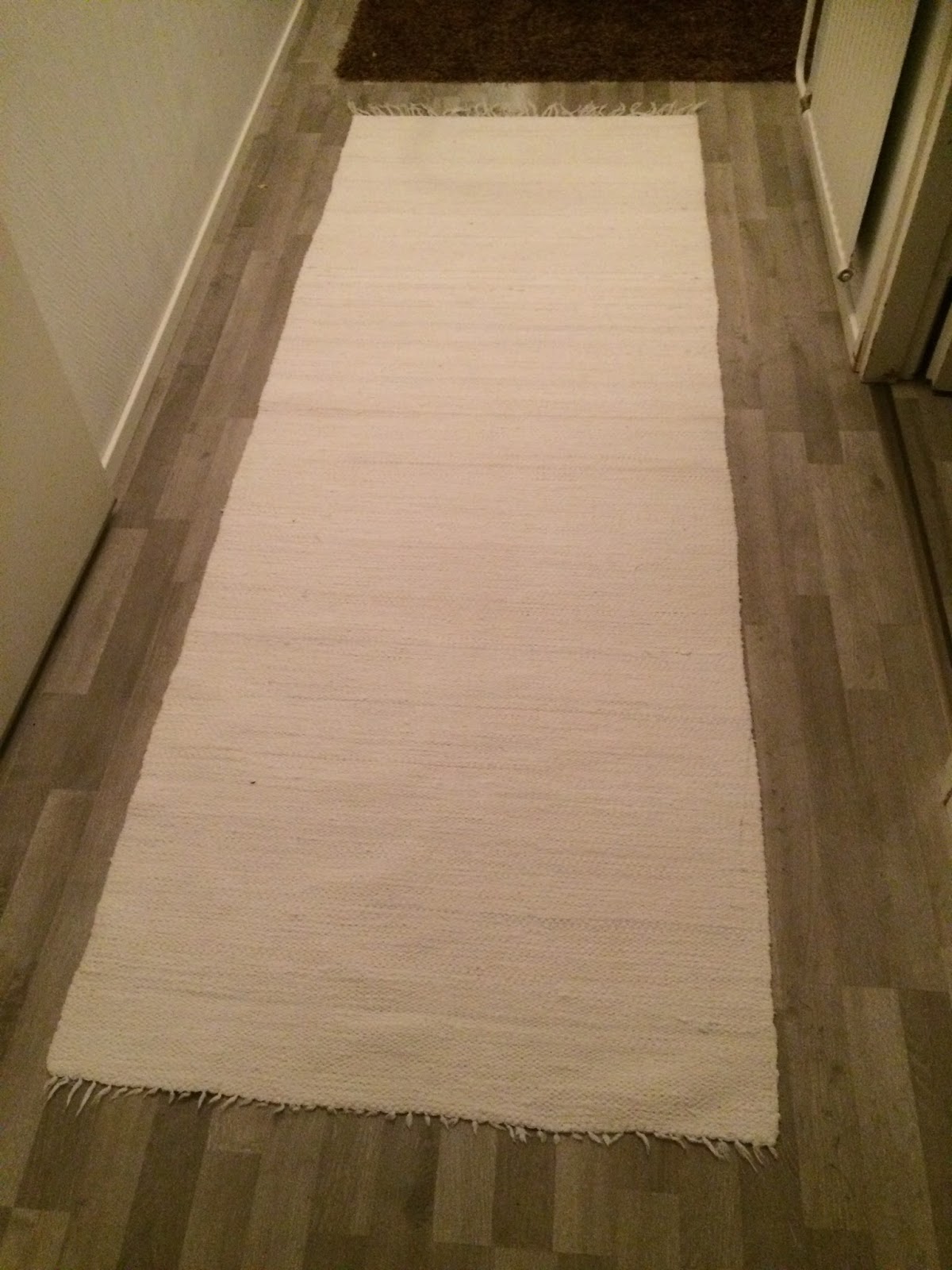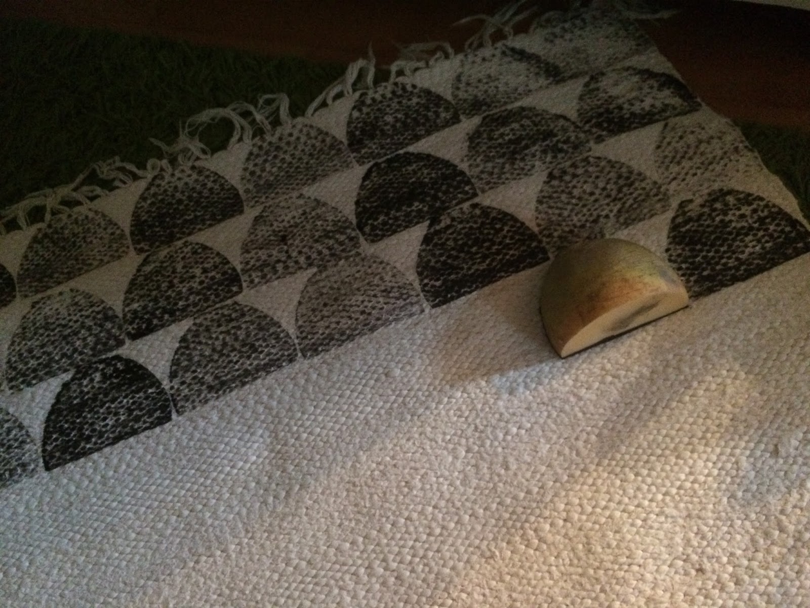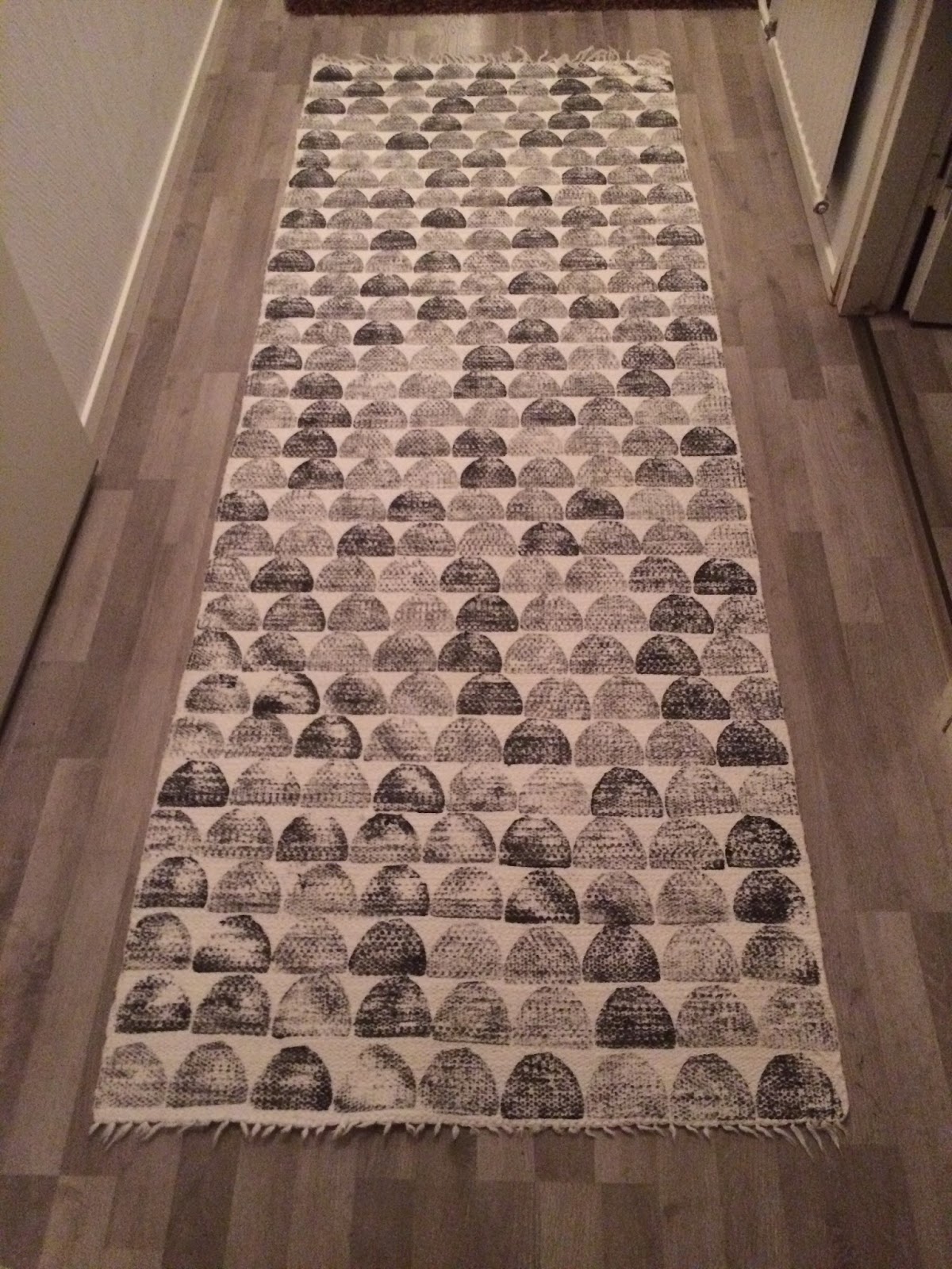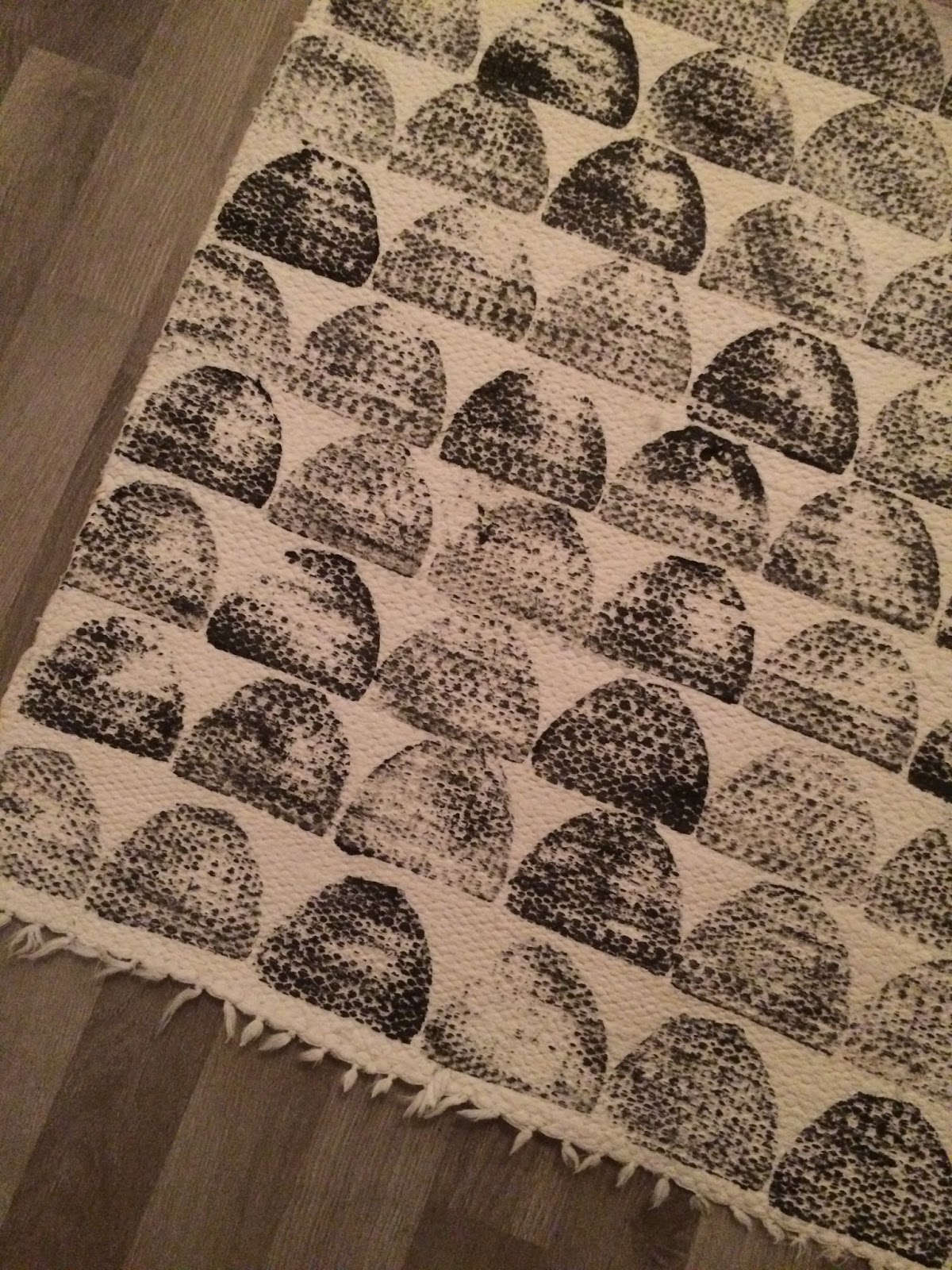 Kuukausi takaperin värkkäilin hieman uutta mattoa. Tai siis maton ostin facebook kirpparilta, mutta tuunailin tätä hieman. Sain idean entisen työkaverini blogista ja päätin myös itse kokeilla. Ajatukseni oli painaa perunalla kuviota mattoon, mutta en löytänyt mistään niin isoa perunaa kuin olisin halunnut joten käytin tähän lanttua. Mahtavuutta!! Värin painelu oli ihan kivaa ja joutusaa hommaa, mutta silittäminen oli jotain ihan täyttä kuraa!! En kyllä ihan heti lähde tähän toista kertaa... :)