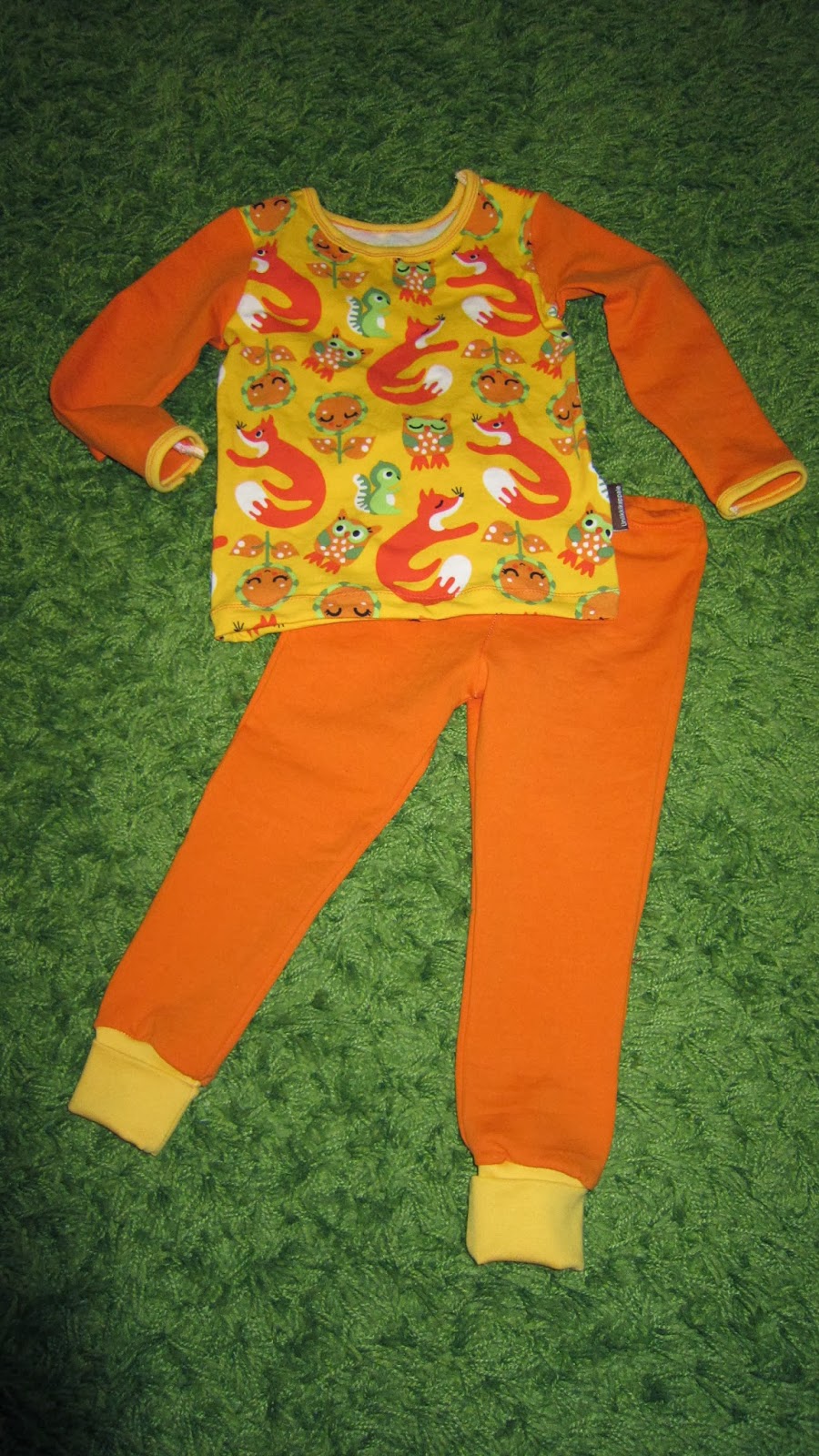 Tässä kuvassa lahjaksi tehty yökkäripuku kettujen ja pöllöjen ystävälle. Kaavat Ottobre lehdestä.