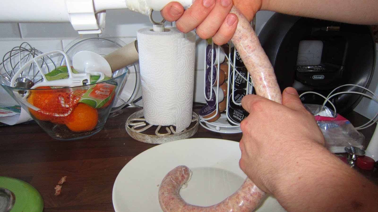 Joulupukki toi viime jouluna miehelleni lihamyllyn ja makkarasuppilot, minun armaaseen yleiskoneeseeni Kitchen Aidiin. Olemme muutaman kerran uskaltautuneet kokeilemaan myös makkarantekoa. Mies on kylläkin hoitanut muuten teon, mutta yhdessä olemme sen suoleen pursottaneet. Makkaran teko on mielestäni aika hauskaa, vaikka vielä se ei ole maullisesti onnistunut niin hyvin kuin olisimme toivoneet. Maku ehkä kohdillaan, mutta makkara ollut liian kuivaa. Tekovaiheesta voin väläyttää nyt hieman kuvia.
