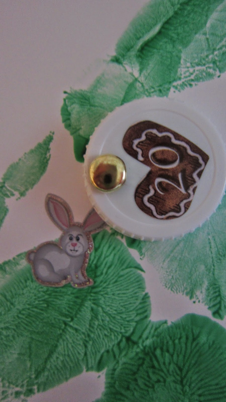 Kuusi ja latvassa oleva tähti tehty sormiväreillä ja kämmenen kuvilla. Luukut ovat maitopurkeista otetut korkit ja ne lävistetty haaraniitillä kartongin lävitse. Omasta jemmasta löytyi tarrat 1-24 numeroilla, jotka sopivat mahtavasti korkkien päälle. Ainoa vaikeus oli löytää sopivan kokoisia tarroja korkkien alle, jotta kuvat eivät näkyisi liikaa.