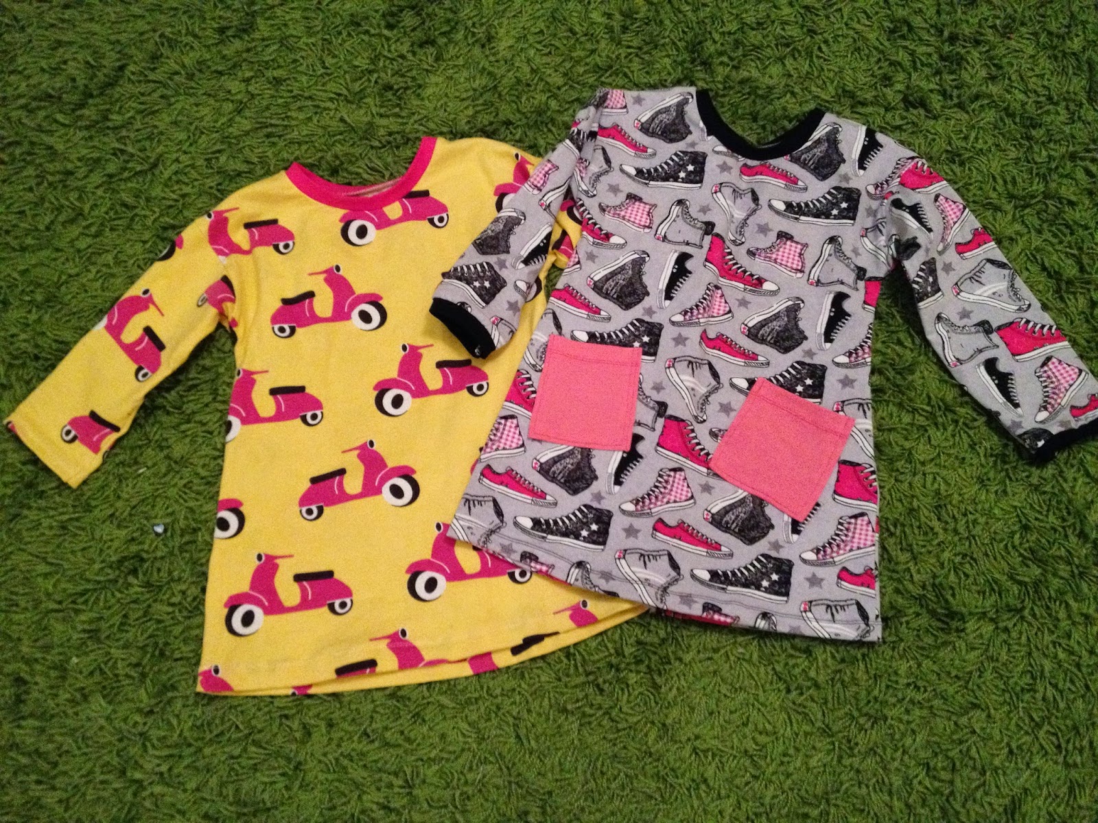 Neiti oli niin onnessaan keltaisesta skootteri mekosta, että halusi pitää sitä päällä monta päivää. Tykkään kyllä itsekkin kyseisestä kankaasta tosi paljon, joten eipä tiedä, vaikka joskus yrittäisi löytää kangasta lisää ja tehdä siitä itsellekkin jotain kivaa. Aika pirtsakka on kangas!! Toisessa kankaassa onkin tennareita sikin sokin! Tämä mekko on hihoista vielä todella iso, joten makoilee vielä vaatekaapissa ja odottaa myöhempää käyttyö.