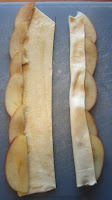 Kauli sulatetut lehtitaikina levyt hieman ohkaisemmiksi Levitä päälle omenamarmeladia ja halkaise kahtia. Laita omenasiivut lomittain toistensa päälle kuvanmukaisesti ja taita taikinan toinen puoli omenoiden päälle. Kieritä taikina rullalle ja laita muffinivuokaan.