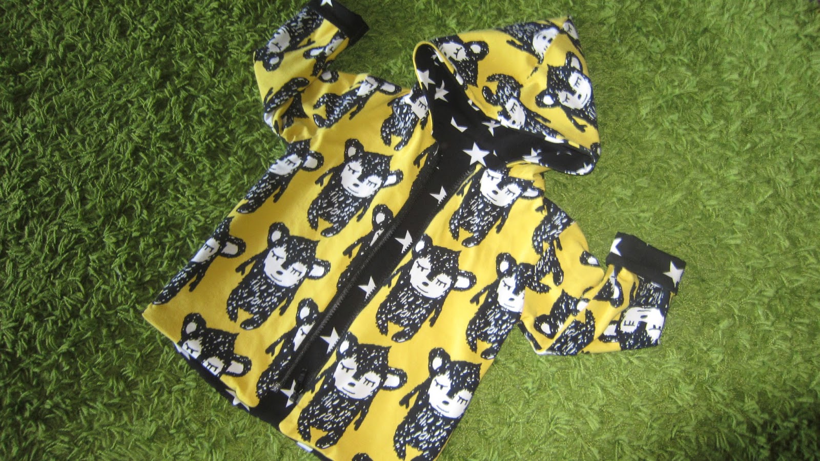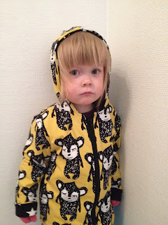 Ihastuin heti tähän ihanaan pikku hippu kankaaseen ja hetken sitä haudoin varastossa ja mietin, että mitä siitä ompelisin, Päädyin tekemään siitä neidille takin, joka onnistuikin mielestäni hyvin. Takin vuorikangas on mustaa tähti trikoota.