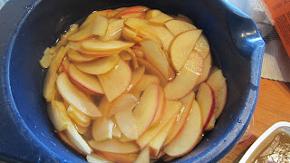 Poista omenoista siemenkota ja halkaise omena. Leikkaa omenan puolikkaat ohuiksi siivuiksi. Laitat siivut kuumuutta kestävään kulhoon ja sirottele sokeri päälle. Kaada kiehuvaa vettä omenasiivujen päälle niin, että ne peittyvät. Anna liota vedessä n.15-20 min. Kaada vesi pois kulhosta.