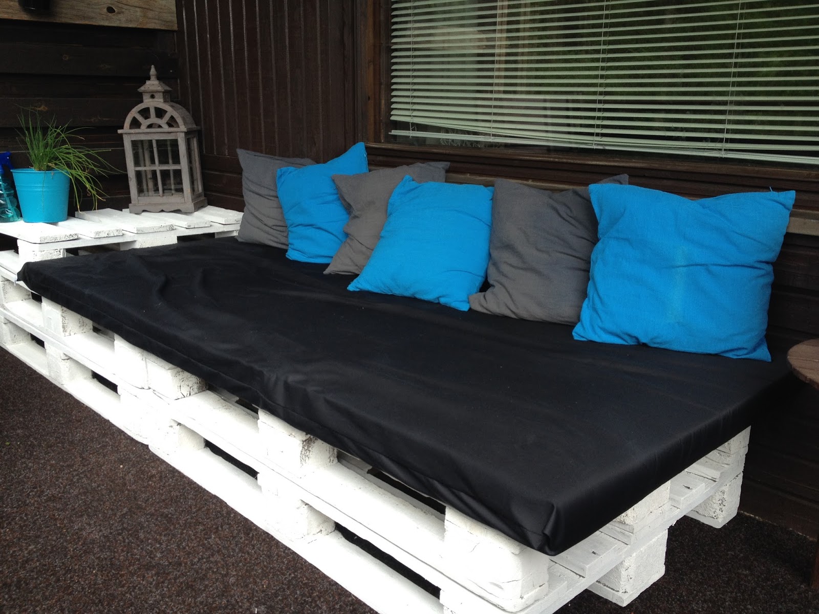 Tällä hetkellä taitaa olla aika IN rakentaa kuormalavoista kaikkea kivaa ja itse olen miettinyt jo pitkään, että parvekkeelle täytyy sohva saada. Meillä on pitkä parveke, jossa ei ole lasitusta, joten pohdin alkuun tämän toimivuutta. Nyt on muutama sadepäivä kokeiltu ja hyvin toimii. Lavat saimme anoppilasta ja neitokaisemme innokkaana niitä meidän kanssamme maalaili. En tiedä osuiko maalia lavoihin enemmän kuin häneen itseensä, mutta kivaa oli. Patjan ostin JYSKistä ja ompelin päälle kankaan, joka kestää hieman likaa ja kosteutta. Kangas hylki ainakin neidin kaatamat mehut täysin. Tyynyjä täytyy hankkia hieman lisää, mutta muuten olen erittäin tyytyväinen. Auringon paistaessa sohvalla on kiva kölliä ja pelata korttia neidin kanssa. Neiti, joka onnessaan lätkii jo korteilla Maijaa.... (Kylläkin hieman muunnelluin säännöin).