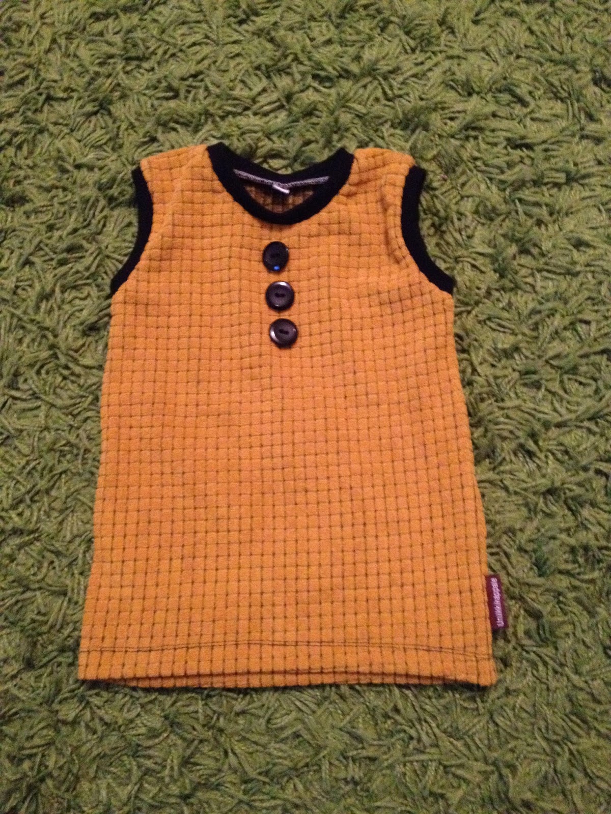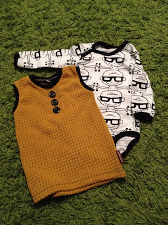 Tässä tämä suloinen Kekkos-body. Kuvassa myös itse kehittelemäni ja ilman kaavoja tehty liivi pojalle. Kangas oli niin ihana, että jotain oli kehitettävä ja tälläinen siitä syntyi. Napeilla saa aikaiseksi hieman näyttävyyttä.