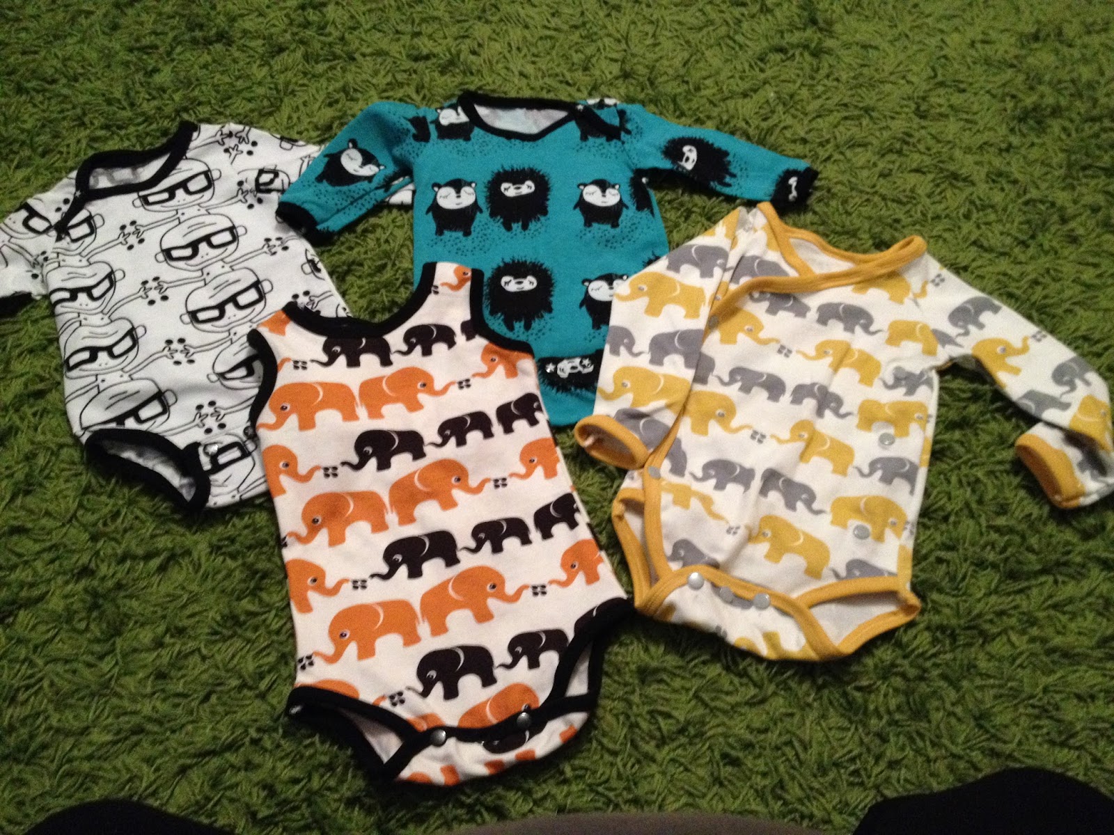 Tässä kuvassa on muutama body, jotka olen jo aikaisemminkin esitellyt blogissa, mutta laitoin ne samaan kuvaan kuitenkin. Eniten odotan, että pääsen pukemaan poikani päälle tuon suloisen Kekkos-kankaasta tehdyn valkomusta bodyn. Niin ihana!!