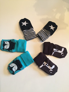 Pikkuisen kynnet ovat kovin pitkät ja alkuun oli käytettävä tumppuja. Päätin ommella itse jämätilkuista muutamat tumput pitkällä resorilla, jotta pysyvät käsissä.